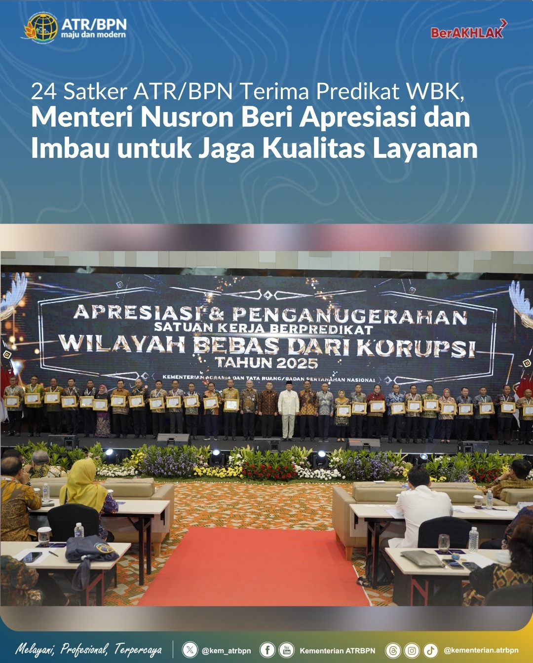 Penghargaan predikat WBK ini diserahkan oleh Menteri Nusron bersama Wakil Menteri ATR/Wakil Kepala BPN, Ossy Dermawan; Sekretaris Jenderal, Dalu Agung Darmawan; serta Asisten Deputi Koordinasi Pelaksanaan Kebijakan dan Evaluasi Reformasi Birokrasi, Akuntabilitas Aparatur dan Pengawasan Wilayah III, Kedeputian Reformasi Birokrasi, Akuntabilitas Aparatur dan Pengawasan Kementerian PANRB, Kamaruddin.