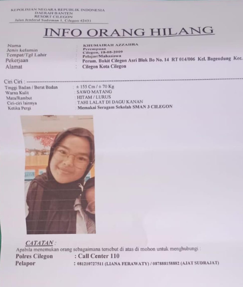 Pencarian anak Hilang a.n.KHUMAIRAH AZZAHRA Bin Ajat Sudrajat