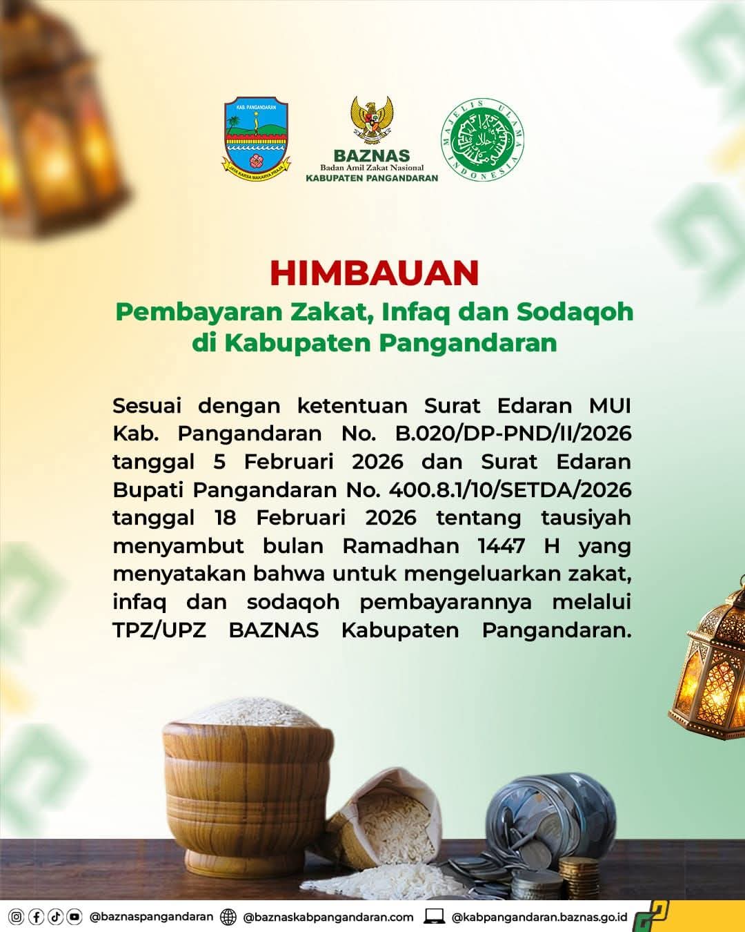 Himbauan tersebut disampaikan untuk menindaklanjuti Surat Edaran Majelis Ulama Indonesia (MUI) Kabupaten Pangandaran Nomor B.020/DP-PND/II/2026 tertanggal 5 Februari 2026 serta Surat Edaran Bupati Pangandaran Nomor 400.8.1/10/SETDA/2026 tertanggal 18 Februari 2026.