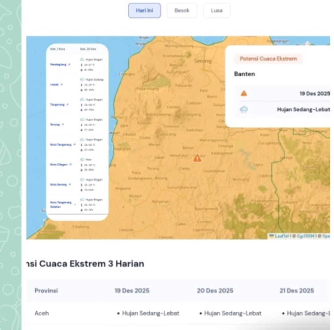SERANG, INAKOR.ID – Polda Banten kembali mengimbau masyarakat untuk meningkatkan kewaspadaan terhadap potensi cuaca ekstrem berdasarkan pembaruan informasi dari Badan Meteorologi, Klimatologi, dan Geofisika (BMKG) Banten per Sabtu, 20 Desember 2025.
