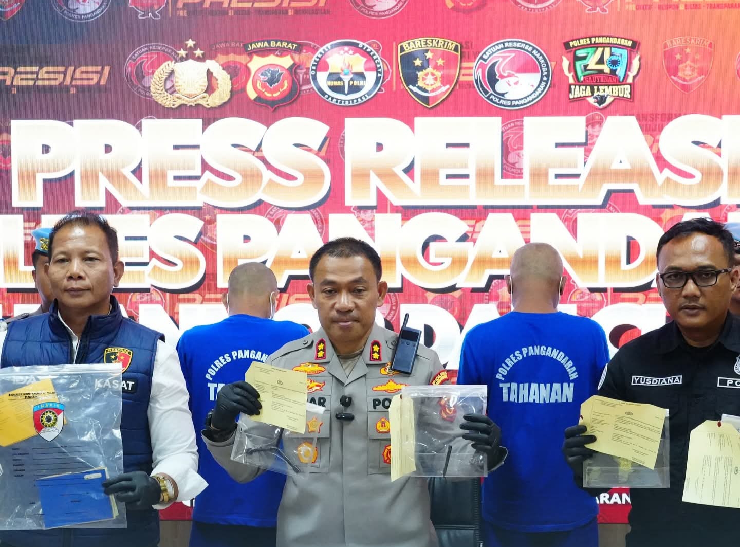 Kapolres Pangandaran AKBP Ikrar Potawari, didampingi Kasatreskrim AKP Idas Wardias, menyampaikan pengungkapan kasus tersebut dalam konferensi pers yang digelar di Mapolres Pangandaran, Senin (12/1/2026).