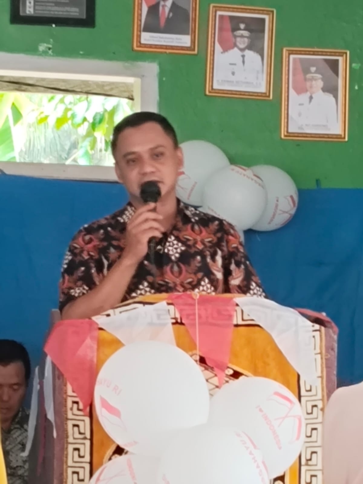 Suasana resepsi semakin semarak dengan dekorasi khas merah putih yang menghiasi aula desa. Bendera kecil, lampu hias, serta ornamen tradisional menciptakan nuansa kebangsaan yang berpadu harmonis dengan budaya lokal. Anak-anak, pemuda, hingga orang tua tampak larut dalam suasana penuh keakraban.