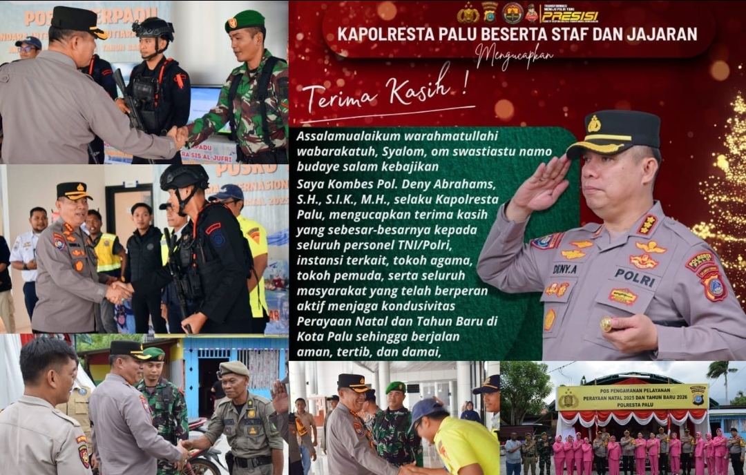 PALU, inakor.id – Kapolresta Palu, Kombes Pol. Deny Abrahams, S.H., S.I.K., M.H., memberikan pernyataan resmi kepada media pada Sabtu (3/1/2026) terkait berakhirnya rangkaian pengamanan akhir tahun. Ia menyampaikan apresiasi mendalam kepada seluruh elemen masyarakat dan aparat keamanan yang telah bersinergi menjaga keamanan di Kota Palu.