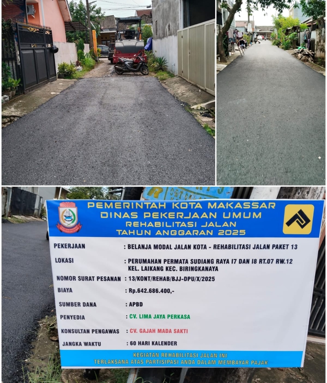 MAKASSAR,INAKOR,ID — Pemerintah Kota Makassar melalui Dinas Pekerjaan Umum (PU) kembali melaksanakan program rehabilitasi jalan pada tahun anggaran 2025 sebagai bagian dari komitmen peningkatan infrastruktur perkotaan. Salah satu pekerjaan yang mulai direalisasikan adalah Rehabilitasi Jalan Paket 13 yang berlokasi di Perumahan Permata Sudiang Raya Blok I.9 dan I.8, RT 07 RW 12, Kelurahan Laikang, Kecamatan Biringkanaya.