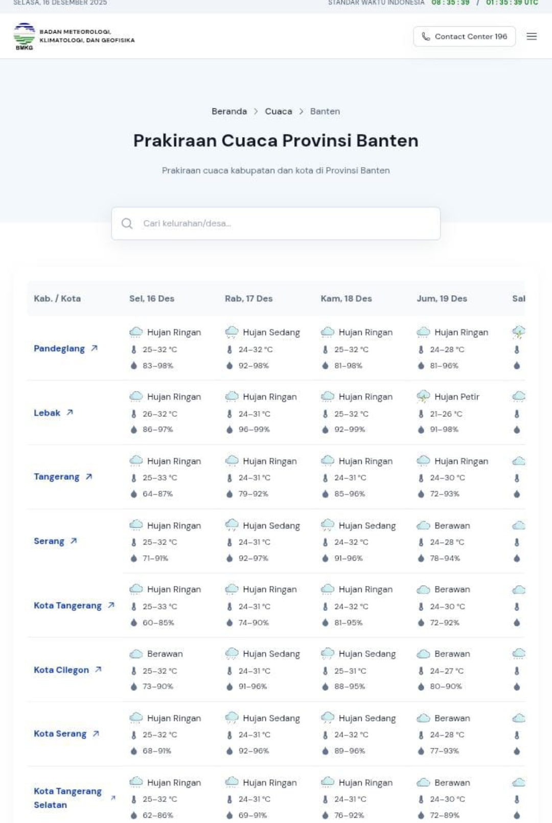 SERANG, INAKOR.ID – Berdasarkan pembaruan informasi dari Badan Meteorologi Klimatologi dan Geofisika (BMKG) pada Selasa (16/12), pukul 07.10 WIB.