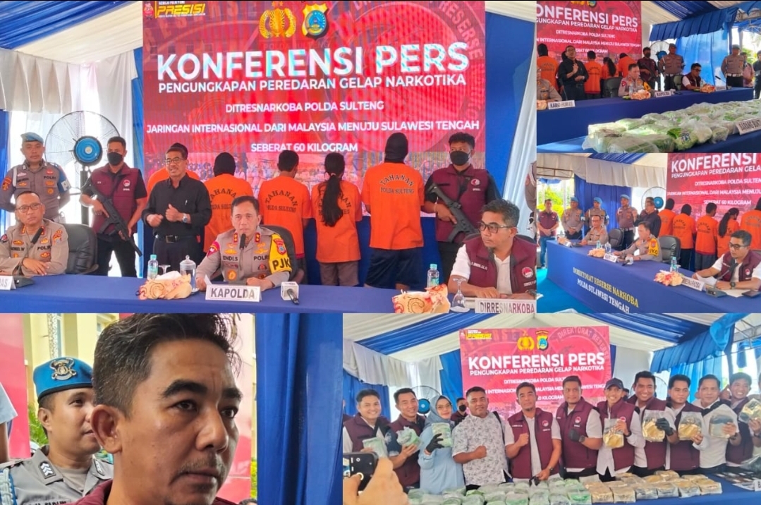 PALU, inakor.id – Kepolisian daerah (Polda) Sulawesi tengah menggagalkan penyelundupan peredaran narkotika jenis sabu jaringan Internasional dari negeri jiran Malaysia masuk melewati perairan Donggala, Provinsi Sulawesi tengah (Sulteng), dengan 60 paket, dibungkus kemasan teh cina berwarna hijau dan kuning seberat 60 kilogram, masing-masing satu kemasan 1 killo gram, di Jalan Trans Palu-Toli-toli, Kabupaten Donggala, 13 November 2025.