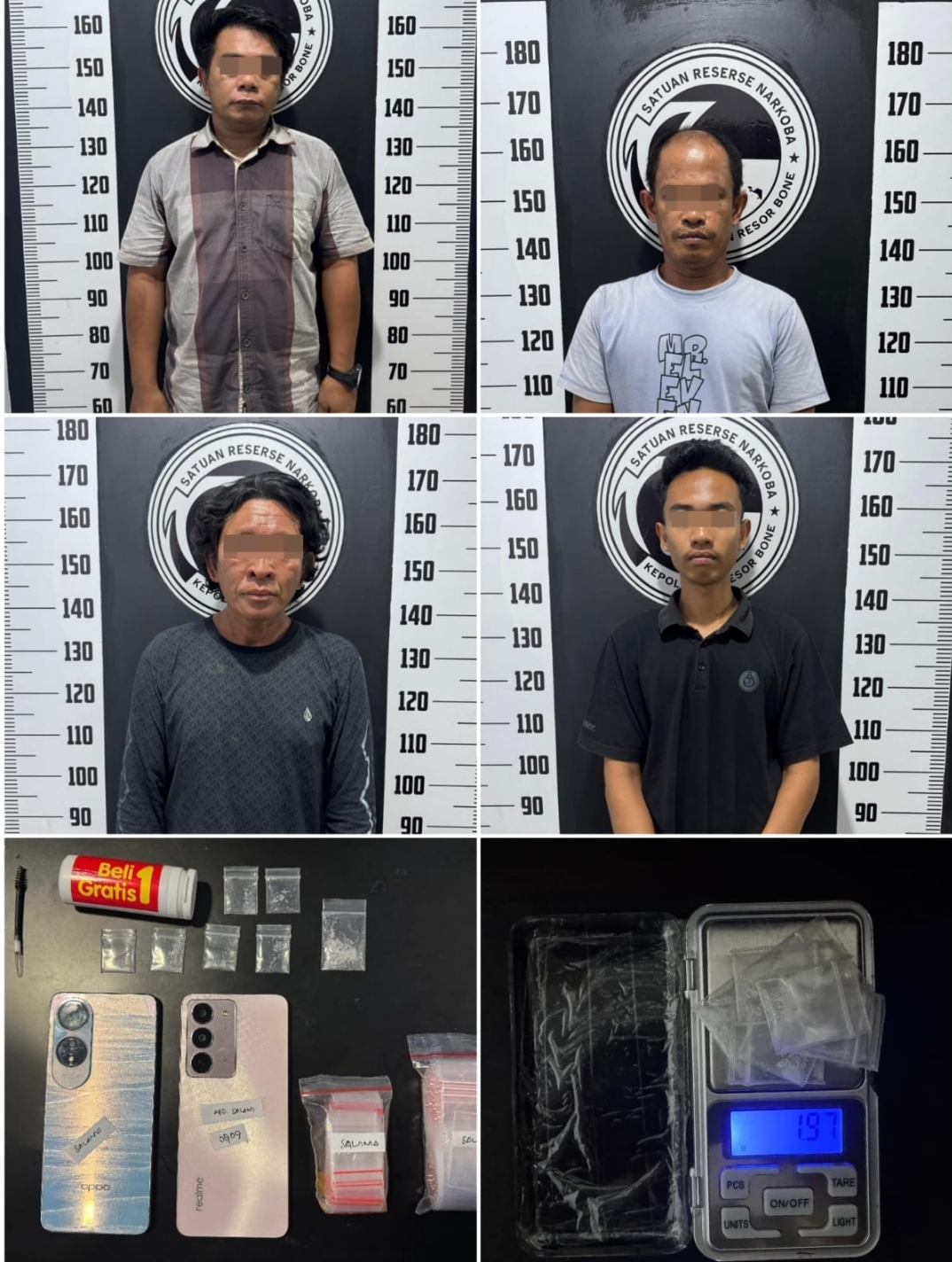 WATAMPONE,INAKOR,ID ,– Satuan Reserse Narkoba (Satresnarkoba) Polres Bone berhasil mengungkap jaringan peredaran narkotika jenis sabu dengan mengamankan empat terduga pelaku di dua lokasi berbeda dalam kurun waktu kurang dari 24 jam. Total barang bukti sabu yang disita mencapai puluhan gram.