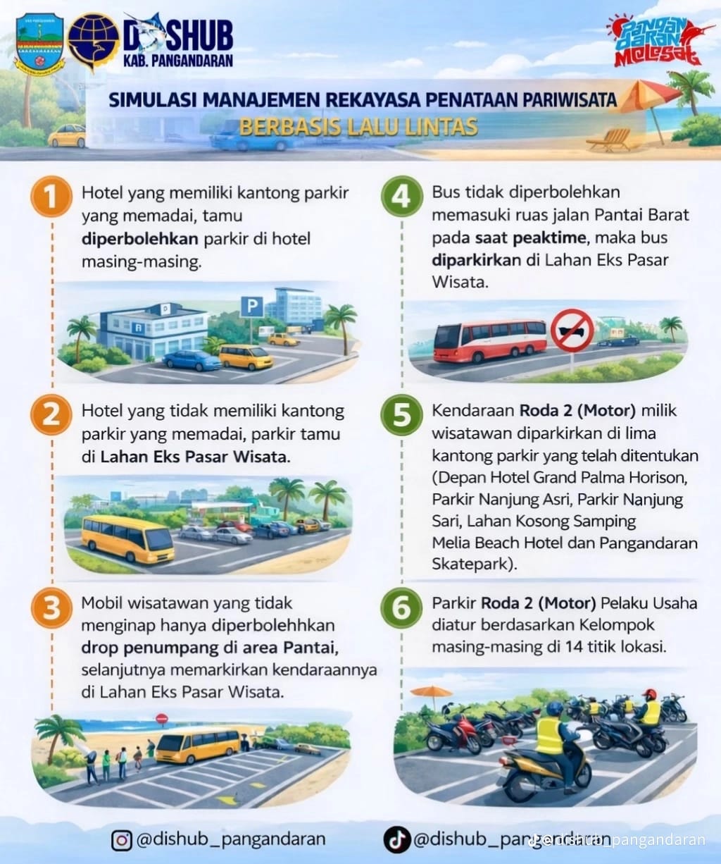 “Simulasi ini kami lakukan untuk memastikan pengaturan lalu lintas di kawasan wisata, terutama Pantai Barat, bisa lebih tertib dan terkontrol, terutama saat peaktime kunjungan wisatawan,” ujar Nana Sukarna, Senin (16/2/2026).